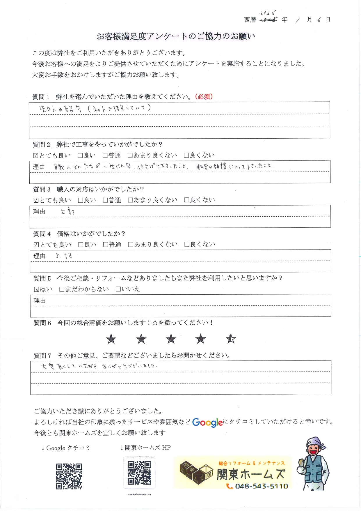 | 理由 | 以前親の家もやっていただいた事もあり、良心的な 金額でやってもらえたと思います |
