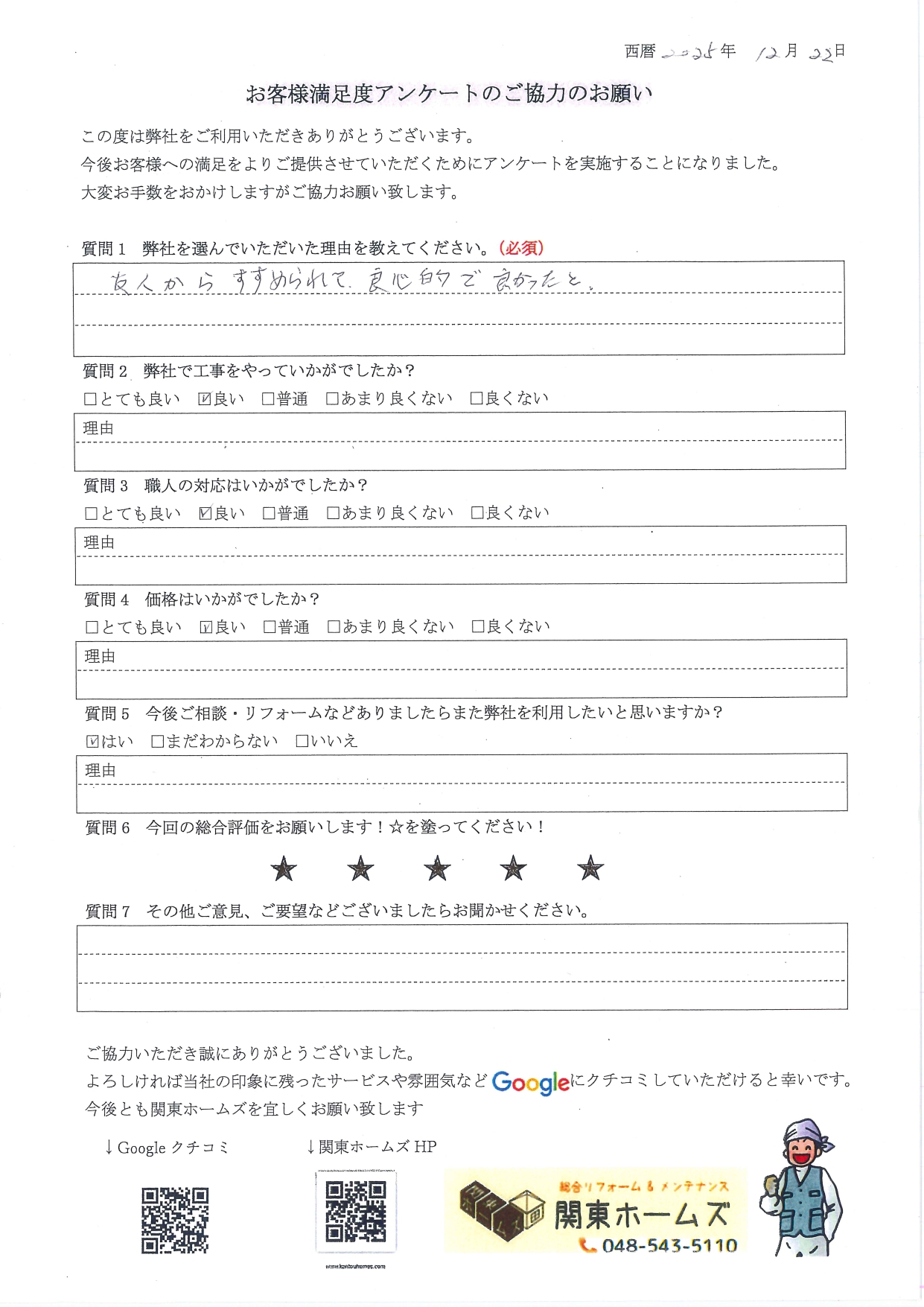 | 理由 | ・今回の工事を満足している為他の人にも紹介したいと思います。 |