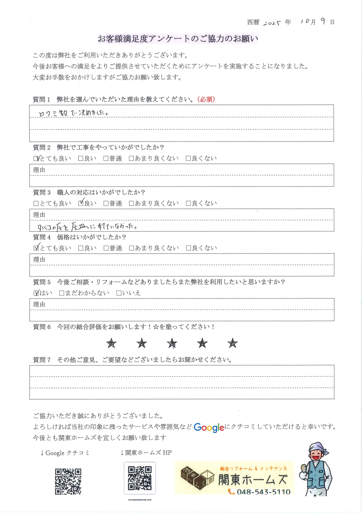 理由 | 工事中、工事前後とも、何か分からないことや不明点、心配な点について伝える とお忙しい中でも丁寧に説明してくださいましたので。 |