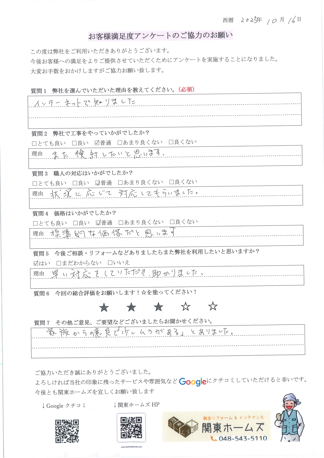 鴻巣周辺のリフォームしてもらえる所をネットにて調べて御社へ連絡した。